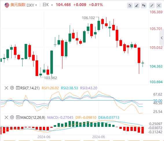 周四,美元指数盘中跳水,一度逼近104关口,最终收跌0.523%,报104.46。美债收益率集体大跌,基准的10年期美债收益率收跌7.4个基点。截至目前,美元报价104.46。
