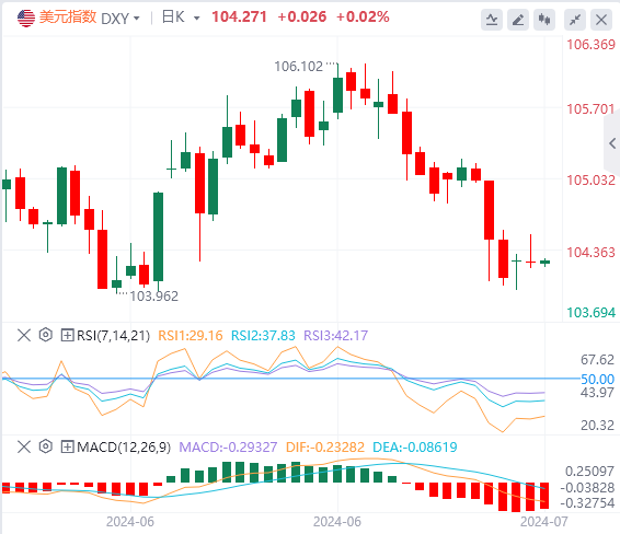 7月17日,北京时间周三亚市早盘,美元指数徘徊在104.27附近。周二,因零售销售数据高于预期,美元指数一度升至104.51,但因市场权衡美联储降息的可能性,美元指数随后回吐日内全部涨幅,最终收跌0.01%,报104.24。基准的10年期美债收益率收报4.1630%,两年期美债收益率收报4.4260%。因交易员加码押注美联储降息和特朗普胜选,现货黄金高开高走,最终收涨1.93%,报2468.40美元/盎司,创历史新高。现货白银最终收涨1.87%,报31.23美元/盎司。因市场担心亚洲需求放缓,国际油价下跌。WTI原油收跌1.47%,报80.73美元/桶;布伦特原油最终收跌1.20%,报83.81美元/桶。