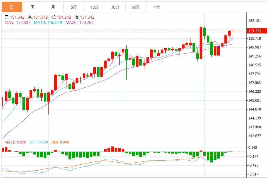日元:美元/日元上涨,收报151.345,涨幅0.25%。技术面上,汇价上行的初步阻力位于151.536,进一步阻力位151.773,关键阻力位于152.158;汇价下行的初步支撑位于150.914,进一步支撑位于150.529,更关键支撑位于150.292。