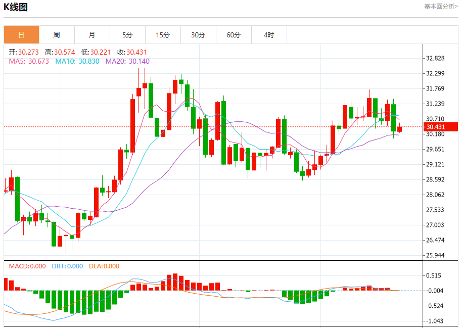 现货白银:截止北京时间20:26,现货白银上涨,现报30.421,涨幅0.45%。纽市盘前,白银价格积极交易,并试图超越图表上出现的小阻力,随机积极性支持继续看涨偏见的机会,并在今天获得更多收益,等待访问31.00美元作为第一站,突破它代表着反弹至31.50美元和32.00美元水平的关键,提醒你牛市的持续取决于30.06美元以上的价格稳定性。