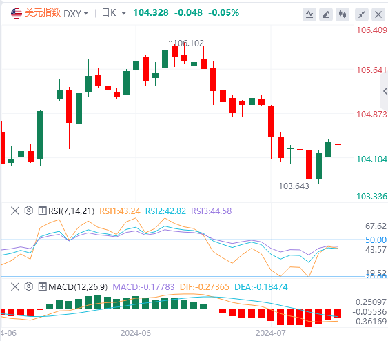上周五,尽管市场对于劳动力市场的担忧仍然存在, 但美元指数在突破104关口后持续反弹,并达到104.40 附近。该走势可以归因于空头放松对于美指的压制并 且市场在寻求避险资产。目前投资者仍在关注美联储 在9月的降息预期和美国脆弱的劳动力市场的情况,这 两个因素可能会给美元指数带来下行压力。
