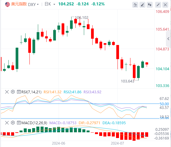 美元指数:截止发稿,美元指数交投于104.25附近。预计货币政策分歧仍将是美元潜在额外收益的关键因素。这种可能的上升趋势也与持续的利差交易找到了共同点,而对美国经济“软着陆”的坚定预期也将成为支撑美元长期走强的一个重要因素。技术面上,美元指数最近的阻力位在104.40-104.60区间。如果美元指数攀升至104.60上方,它将走向下一个阻力位105.90-106.10。
