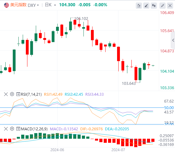 7月23日,北京时间周二亚市早盘,美元指数徘徊在104.30附近。周一,因市场消化拜登退选事件的冲击,美元指数小幅收跌,最低触及104.16,最终收跌0.07%,报104.30。基准的10年期美债收益率收报4.2560%,两年期美债收益率收报4.5260%。因市场等待美国更多经济数据,现货黄金几乎收平,盘中一度跌至2383.92,最终收跌0.12%,报2397.50美元/盎司。现货白银最终收跌0.36%,报29.10美元/盎司。因市场预计第四季度原油将达到供需平衡,明年将出现过剩,国际油价下跌。WTI原油收跌0.50%,报78.19美元/桶;布伦特原油最终收跌0.44%,报82.24美元/桶。