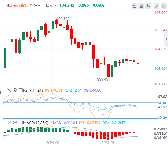 上周五,美元指数继续维持区间震荡,最低触及 104.19,最终收跌0.08%,报104.32。美债收益 率大幅下行,基准的10年期美债收益率跌至4.2 关口%,两年期美债收益率收报4.3850%。截至目前,美元报价104.24。