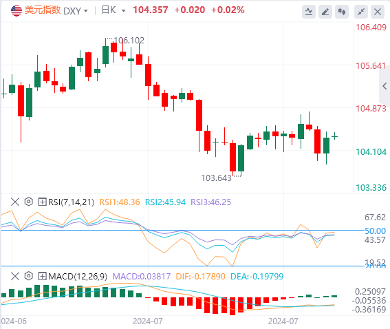 美元指数:截止发稿,美元指数交投于104.35附近。美元指数基本持平,鲍威尔表示,在美联储投票决定将基准利率维持在20多年来的最高水平后,美联储可能最早在9月份降息。两年期美国国债收益率走低,标准普尔500指数当天上涨,而美元继续走低。根据期货市场的数据,9月份降息25个基点的预期仍高于预期,这意味着投资者看到了更大幅度降息的可能性技术面上,相对强弱指数(RSI)和移动平均收敛散度(MACD)虽然尚未完全恢复,但显示出逐渐回归中性区域,但如果它们跃升至正值区域,则美元指数将进一步下跌。该指数继续在104.15和104.00水平获得支撑,而阻力位在104.50和105.00水平。