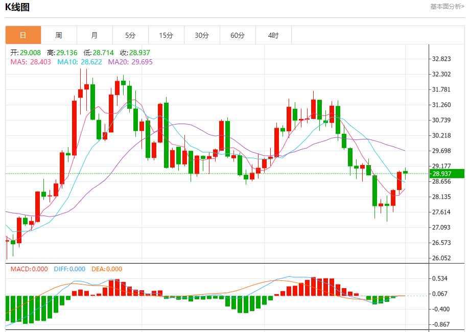 现货白银:截止北京时间20:11,现货白银下跌,现报28.929,跌幅0.16%。纽市盘前,银价明显突破28.55美元水平,并于昨日收于该水平之上,在接下来的交易中实现预期收益,目标是测试29.30美元,随后是30.06美元水平,作为下一个主要站。