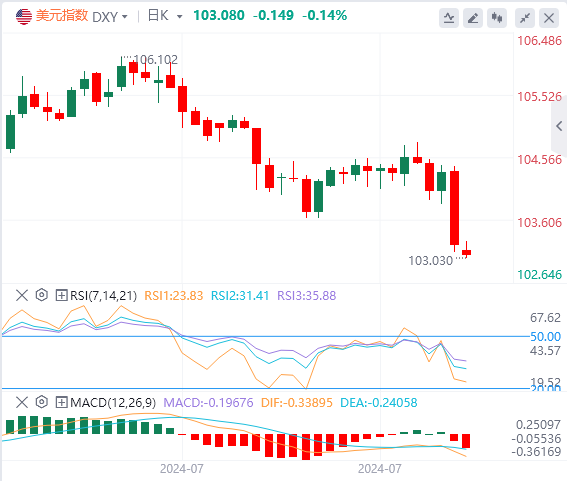 8月5日,北京时间周一亚市早盘,美元指数徘徊在103.08附近。上周五,由于糟糕的非农数据直接点燃了市场对美联储9月降息50个基点的预期,美元指数日内大挫1%,创四个月以来新低,最终收跌1.06%,报103.22;日元涨2%升破147、人民币飙涨超千点;美债收益率同样大跌,基准的10年期美债收益率跌破3.8%,收报3.793%,两年期美债收益率失守4%关口,收报3.890%。尽管市场正在定价美联储9月降息50个基点的预期,但衰退担忧似乎略占上风,现货黄金坐上“过山车”,其在美盘前一度涨近2480美元大关,但不久后急速下挫,跌幅超60美元,而后又有所回升并重回2440美元上方,最终收跌0.02%,报2441.79美元/盎司。现货白银最终收涨0.08%,报28.54美元/盎司。由于市场对美国陷入经济衰退的担忧被点燃,原油大跌超3%。WTI原油在美盘前跌势不止,并一度失守73美元,最终收跌3.66%,报73.57美元/桶;布伦特原油失守80美元大关,并一度跌至76.28美元的日内低点,最终收跌3.36%,报77.28美元/桶。