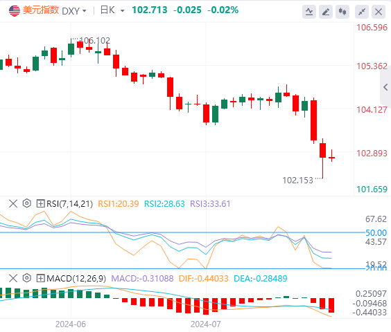 美元指数:截止发稿,美元指数交投于102.71附近。美元在周一开盘时初面临抛售压力,但在7月份ISM服务业积极数据发布后,随后抹去了失地。该指数最初跌至102.20,但回升至102.70附近。尽管数据乐观,但市场担心美国经济前景变得疲软,投资者担心美国可能走向衰退。技术面上,在上周令人失望的就业报告发布后,美元指数前景转为看跌。该指数跌破20天和200天简单移动平均线(SMA)。基于动量的相对强弱指数(RSI)和移动平均收敛散度(MACD)也有所下降,表明抛售压力增加。然而,RSI低于30表明修正可能迫在眉睫。