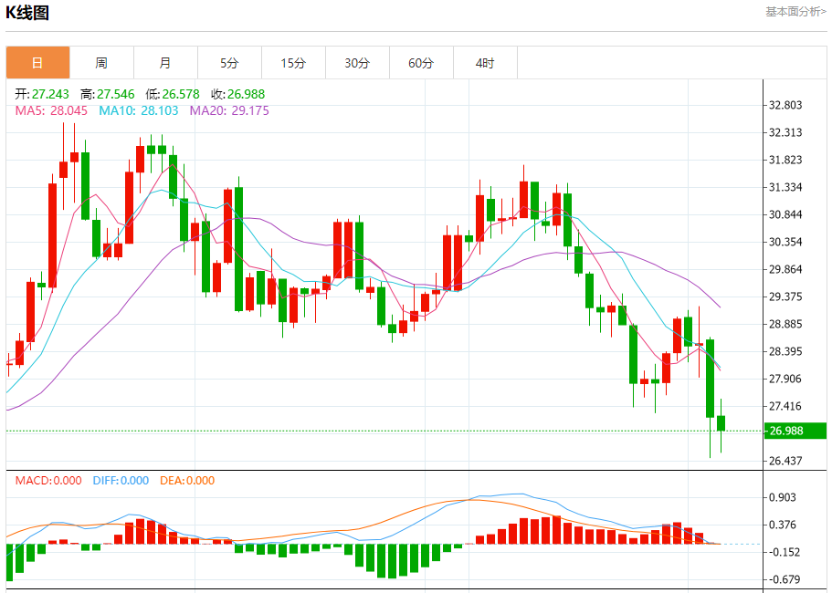现货白银:截止北京时间20:20,现货白银下跌,现报26.990,跌幅0.86%。纽市盘前,白银价格显示额外的负面交易超过27.00美元关口,并在该关口下方结算,强化了在即将到来的交易中继续主导熊市趋势的预期,并为目标26.12美元开辟了道路,这代表着我们的下一站,由EMA50形成的负面压力支撑,提醒您熊市的持续需要持有27.62美元以下。