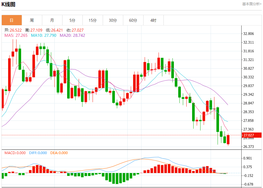 现货白银:截止北京时间20:22,现货白银上涨,现报27.039,涨幅1.70%。纽市盘前,白银价格仍低于27.00美元关口,随机指标开始失去积极的动力,等待获得负面动机,以推动价格恢复未来一段时间的预期熊市趋势,其下一个目标位于26.12美元,提醒您保持低于27.62美元以继续建议的下跌是重要的。