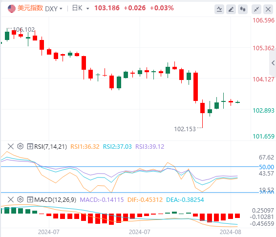 上周五,美元指数区间震荡,盘中一度向下逼近 103,截至目前,美元报价103.18。