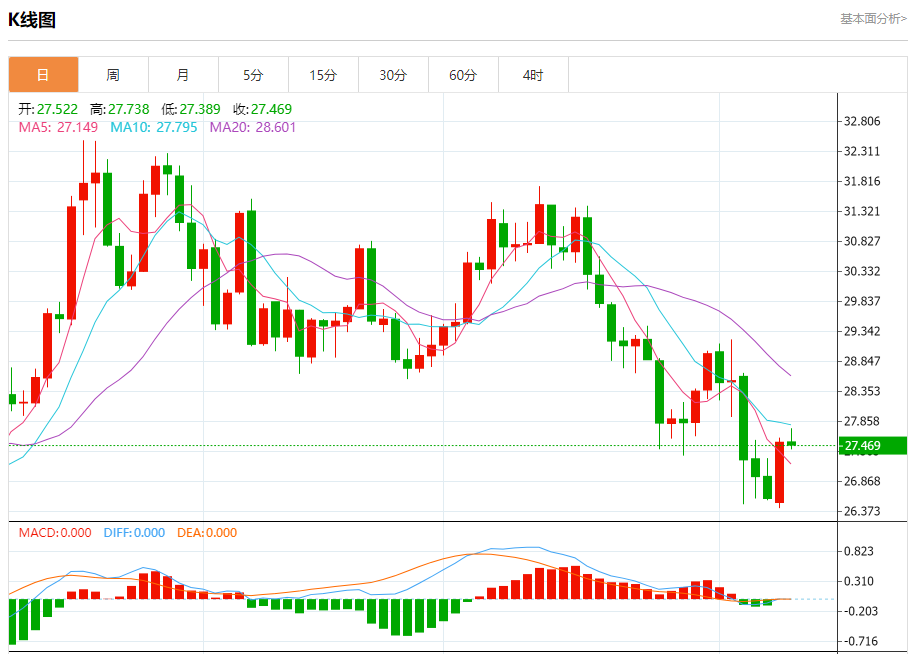 现货白银:截止北京时间20:20,现货白银下跌,现报27.470,跌幅0.18%。纽市盘前,白银价格在27.62美元附近徘徊,我们保持中立直到现在,等待下一个趋势得到更明确的信号,继续根据这一水平监测价格。