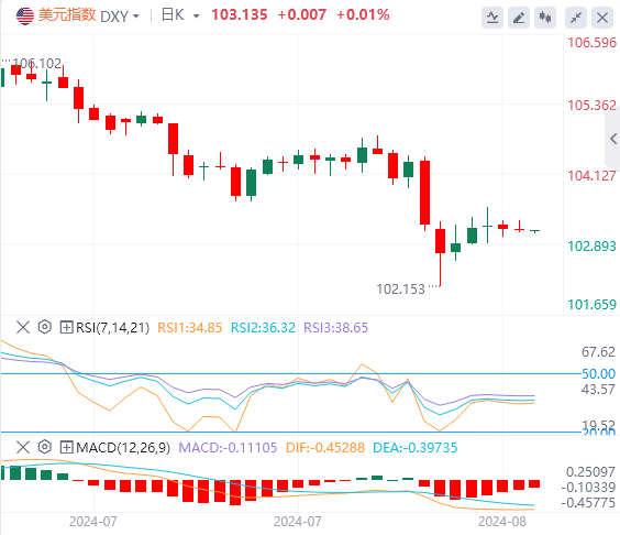 8月13日,北京时间周二亚市早盘,美元指数徘徊在103.13附近。周一,美元指数在103关口上方震荡,最终微跌0.031%,报103.13;美债上涨推动收益率走低,基准的10年期美债收益率收报3.918%,对货币政策更敏感的两年期美债收益率收报4.038%。受避险资金流入的推动,现货黄金大幅走高,站上2470美元大关,最终收涨1.69%,报2472.14美元/盎司,为8月2日以来的最高点。现货白银最终收涨1.84%,报27.96美元/盎司。由于伊朗对以色列的报复行动在即引发对原油供应中断的担忧,国际油价大涨。WTI原油最终收涨3.35%,报79.58美元/桶;布伦特原油最终收涨2.89%,报82美元/桶。
