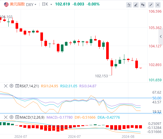 8月14日,北京时间周三亚市早盘,美元指数徘徊在102.61附近。周二,美元指数在PPI数据提振美联储降息预期后跳水,最终收跌0.491%,报102.62。美债收益率集体下跌,基准的10年期美债收益率收报3.846%,创一周以来新低;对货币政策更敏感的两年期美债收益率跌破4%关口,收报3.94%。受美债收益率和美指走软的支撑,现货黄金持稳在历史高点附近,最终收跌0.29%,报2465.06美元/盎司。现货白银最终收跌0.38%,报27.86美元/盎司。由于原油供应可能过剩的前景盖过了对中东冲突升级的担忧,国际油价回落,止步于四日连涨。WTI原油最终收跌1.25%,报78.58美元/桶;布伦特原油最终收跌1.29%,报80.94美元/桶。
