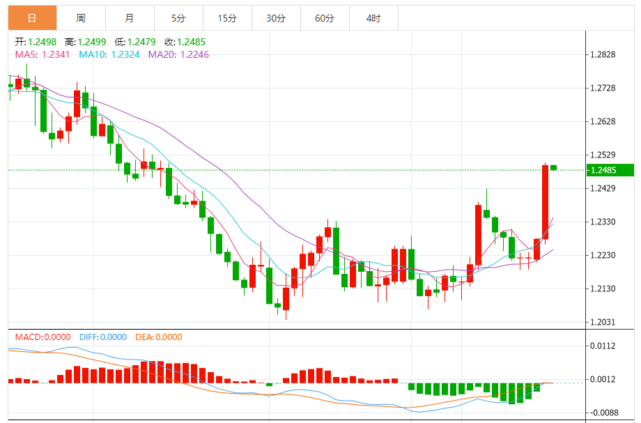 英镑:英镑/美元上涨,收报1.2498,涨幅1.79%。技术面上,汇价上行的初步阻力位于1.2282,进一步阻力位于1.2343,关键阻力位于1.2378;汇价下行的初步支撑位于1.2187,进一步支撑位于1.2152,更关键支撑位于1.2091。