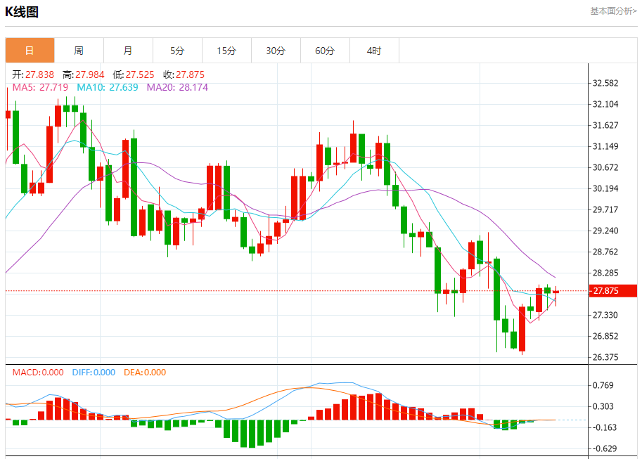 现货白银:截止北京时间20:18,现货白银上涨,现报27.872,涨幅0.13%。纽市盘前,银价再次测试熊市通道的阻力线,注意到随机指标再次失去积极的势头,等待激励价格恢复负面交易以突破27.62美元,并打开通往27.00美元的道路作为下一个负站,以保持熊市趋势情景活跃,提醒您突破27.85美元将停止预期的下跌,并推动价格转向上涨。