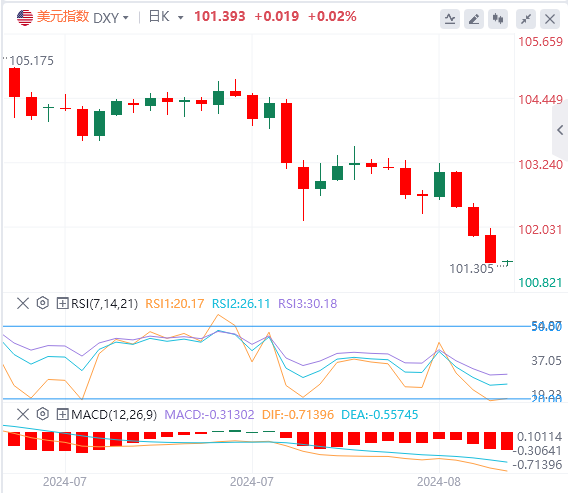 101.39附近。周二,美元指数跌跌不休,最终收跌0.484%,报101.37,再创今年1月份以来新低。美债收益率走低,基准的10年期美债收益率收报3.81%;对货币政策更敏感的两年期美债收益率失守4%关口,最终收报3.992%。随着投资者对美联储可能在9月降息的信心增强以及黄金ETF购买量改善,现货黄金延续创纪录涨势,美盘一度创下2531.6美元/盎司的历史新高,随后涨幅缩窄,最终收涨0.39%,报2514.02美元/盎司。现货白银冲高回落,最终收跌0.03%,报29.44美元/盎司。对亚洲需求的担忧以及加沙停火的希望引发了油市的抛售,国际油价跌至两周新低。WTI原油跌破73美元关口,最终收跌1.03%,报72.99美元/桶;布伦特原油最终收跌0.94%,报76.65美元/桶。