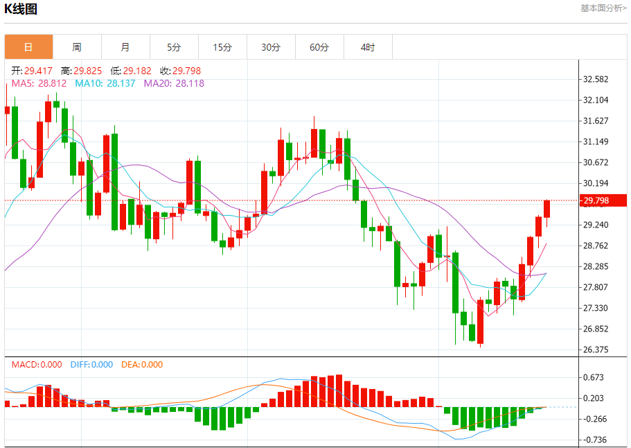 现货白银:截止北京时间20:20,现货白银上涨,现报29.809,涨幅1.31%。纽市盘前,白银价格现在提供了明确的积极交易,接近我们新等待的目标30.06美元,并且在确认突破前一水平后,似乎有可能超越这一水平并获得额外的收益,达到31.00美元,以在价格稳定在29.30美元以上的情况下保持今天的看涨趋势有效和活跃。