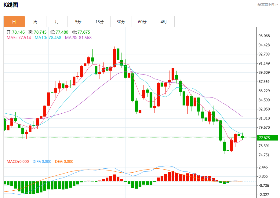 原油市场:截止北京时间21:18,美油下跌,现报77.850,跌幅0.43%。纽市盘前,原油价格面临测试77.86水平的负面压力,价格需要保持在这一水平以上以保持看涨趋势,等待突破78.50,以缓解向81.20的下一个积极目标反弹的任务。