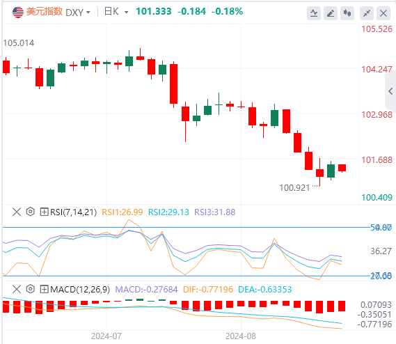 随着下跌动能的减弱,美指的技术前景已经发生了转变,为市场提供了一些喘息的空间。技术指标也出现了些变化,RSI一度进入超卖区域,但目前已经有所回升。MACD目前走势平稳,这表明下跌势头正趋于平缓。总体来看,技术指标显示,在空头推动美指触及年度低点之后,正在逐步恢复。
