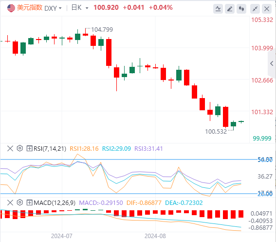 8月27日,北京时间周四亚市早盘,美元指数徘徊在100.9附近。周一,因地缘紧张局势升温促进市场对避险货币的需求,美元指数从8个月的低点回升,最终收跌0.20%,报100.88。基准的10年期美债收益率收报3.8180%;对货币政策更敏感的两年期美债收益率最终收报3.9440%。现货黄金延续昨日涨势,一度触及2525美元,但因美元指数走强和交易员获利了结,美盘时段跳水近10美元,最终收涨0.23%,报2517.68美元/盎司。现货白银最终收涨0.21%,报29.89美元/盎司。因利比亚东部政府宣布将停止所有石油生产和出口,国际油价大涨。WTI原油最终收涨2.92%,报77.10美元/桶;布伦特原油重回80美元大关,最终收涨2.77%,报81.24美元/桶。