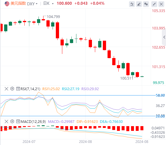 8月28日,北京时间周三亚市早盘,美元指数徘徊在100.6附近。周二,受到即将到来的美国降息前景推动,美元指数跌至逾一年最低点,本月有望创下自2022年11月以来的最大单月跌幅,最终收跌0.30%,报100.56。美债倒挂幅度收窄,基准的10年期美债收益率收报3.8310%;对货币政策更敏感的两年期美债收益率最终收报3.9120%。因伊以冲突的不确定性和美元指数走弱,现货黄金三连阳,再度上攻2525,最终收涨0.27%,报2524.40美元/盎司。现货白银最终收涨0.24%,报29.96美元/盎司。因美国高级将领称以色列与真主党之间冲突扩大的危险已有所缓解,油价回落,利比亚停产和中东紧张局势引发的涨势暂停。WTI原油最终收跌1.81%,报75.70美元/桶;布伦特原油失守80美元,最终收跌1.77%,报79.81美元/桶。