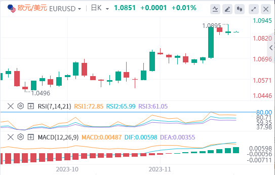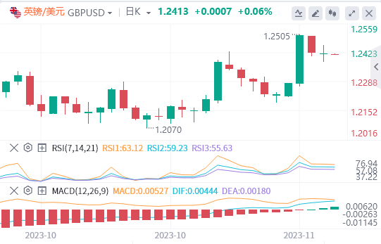 欧元:截止发稿,欧元/美元徘徊于1.0851附近。昨日欧元/美元上涨,收报1.0851,涨幅0.05%。欧盟统计局将公布 10 月份消费者物价指数(CPI)终值,预计不会出现意外。欧央行行长拉加德将在法兰克福欧洲银行业大会上发表讲话,但其讲话不太可能产生重大影响,因为市场预计欧央行将在接下来的会议上维持利率不变。美国将公布房屋开工率和营建许可技术面上,日线图显示,欧元/美元在1.0830和1.0890之间横盘震荡,维持近期涨幅,位于关键的简单移动均线上方。欧元/美元仍倾向于上行,但需要明确突破 1.0900 关口,才能打开进一步上涨的大门。跌破 1.0790 将预示着延续调整。