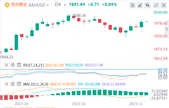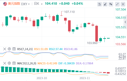 美元指数:截止发稿,美元指数交投于104.41附近。美元仍面临压力,因为在美国失业救济申请和工业生产数据疲软后,市场对美联储(Fed)的积极性低于预期表示了更多的押注。随着劳动力市场疲软和通胀回落,美国经济正显示出降温迹象,这使得美联储在即将到来的12月会议上加息的可能性极低。话虽如此,在2023年做出最后决定之前,该行将收到额外的CPI和非武装工资报告,这可能会影响他们最终是否决定加息。技术面上,日线图显示,美元的技术前景从中性到看跌,牛市本周已经失去了重要地位,难以积聚动力。RSI向南指向50以下,而MACD直方图显示出较大的红条。缩小来看,尽管空头有所斩获,并将指数推至20天SMA以下,但多头仍在扞卫100天平均线,这表明如果卖方未能征服它,在更大的背景下,前景仍将是积极的。