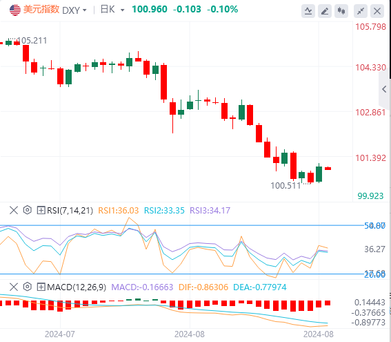 8月29日,北京时间周四亚市早盘,美元指数徘徊在100.96附近。周三,因月末买盘和技术交易,美元指数创下6月3日以来最大涨幅,最终收涨0.50%,报101.06。美债收益率曲线倒挂幅度进一度收窄,基准的10年期美债收益率收报3.8400%;对货币政策更敏感的两年期美债收益率最终收报3.8730%。因美元走强和交易员获利了结,现货黄金日内大跌逾20美元,险守2500关口,最终收跌0.89%,报2502.00美元/盎司。现货白银最终收跌2.84%,报29.11美元/盎司。因美国原油库存降幅小于预期以及对全球需求的担忧持续存在,国际油价大幅下跌。WTI原油最终收跌1.81%,报74.33美元/桶;布伦特原油最终收跌3.04%,报77.38美元/桶。