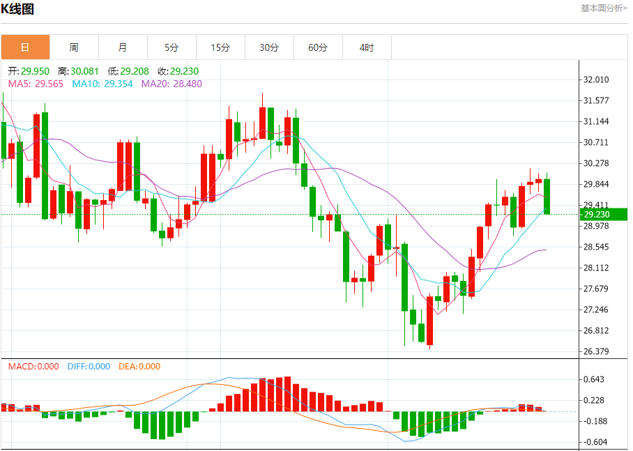 现货白银:截止北京时间20:22,现货白银下跌,现报29.242,跌幅2.36%。纽市盘前,白银价格以明显的利空交易,达到29.30美元的等待目标,显示出一些轻微的看涨偏见,我们建议恢复看跌偏见,以打破上述水平,并实现达到28.55美元的额外利空目标。