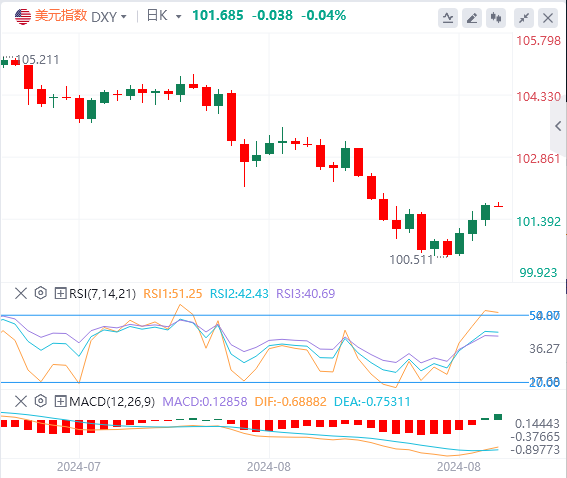 9月2日,北京时间周一亚市早盘,美元指数徘徊在101.68附近。上周五,因美国PCE数据不支持美联储降大幅降息50个基点,美元指数小幅上涨0.36%,报101.73。基准的10年期美债收益率收报3.9080%;对货币政策更敏感的两年期美债收益率最终收报3.9230%。因美联储降息预期遇冷、美元指数走强和投资者获利了结影响,现货黄金险守2500大关,最终收跌0.70%,报2502.98美元/盎司。现货白银最终收跌1.98%,报28.86美元/盎司。因投资者预期OPEC+将从10月开始增加供应,以及美国消费者支出强劲打压9月大幅降息预期,国际油价大跌。WTI原油最终收跌3.11%,报73.59美元/桶;布伦特原油最终收跌2.23%,报76.99美元/桶。