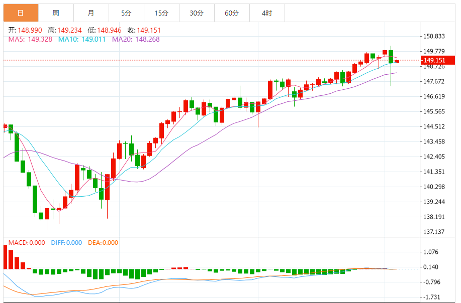 日元:美元/日元下跌,收报149.102,跌幅0.58%。技术面上,汇价上行的初步阻力位于150.331,进一步阻力位151.672,关键阻力位于153.183;汇价下行的初步支撑位于147.479,进一步支撑位于145.968,更关键支撑位于144.627。