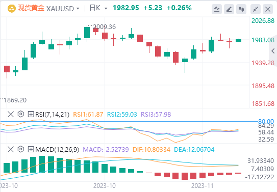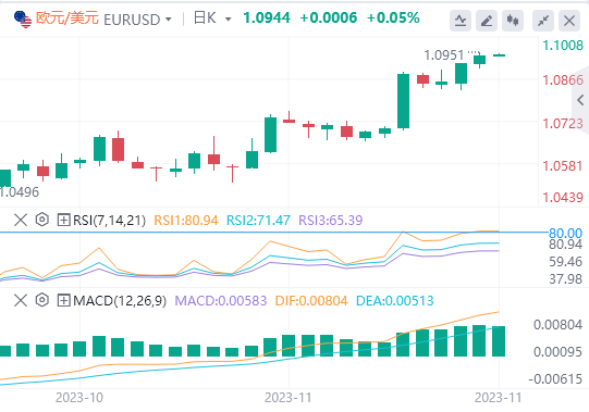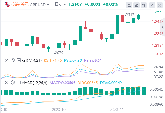 美元指数:截止发稿,美元指数交投于103.47附近。根据芝加哥商品交易所联邦观察工具的数据,投资者已经为12月的不加息定价,并押注于2024年5月的降息速度比预期的要快。相当一部分人甚至把赌注押在了3月份的降息上。本周的亮点包括联邦公开市场委员会(FOMC)11月会议记录、周三发布的10月耐用品订单以及周五发布的11月标准普尔PMI。技术面上,根据日线图,随着抛售压力的增加,美元指数显示出看跌倾向,表明有利于空头的转变。RSI越来越接近超卖条件,表明可能会出现向上修正,而MACD直方图显示出更大的红条。在更广泛的范围内,该指数低于20、100和200天SMA,这表明买家正在努力克服整体看跌趋势,空头仍然掌权。
