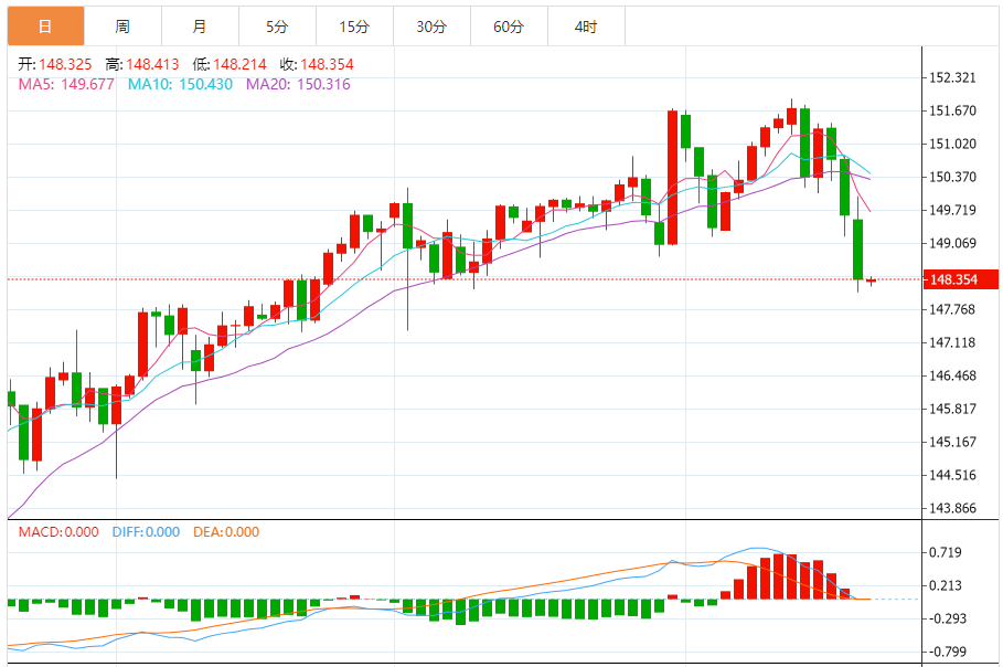 日元:美元/日元下跌,收报148.359,跌幅0.76%。技术面上,汇价上行的初步阻力位于149.55,进一步阻力位150.70,关键阻力位于151.42;汇价下行的初步支撑位于147.68,进一步支撑位于146.96,更关键支撑位于145.81。