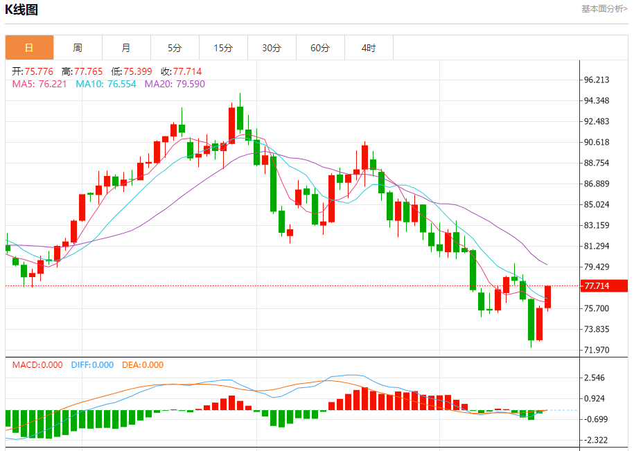 原油市场:截止北京时间21:18,美油上涨,现报77.724,涨幅2.58%。纽市盘前,原油价格试图确认突破熊市通道的阻力,以支持今天预期的牛市趋势的延续,其目标从77.86开始,注意到突破这一水平将延长牛市,达到79.60作为下一个正站。
