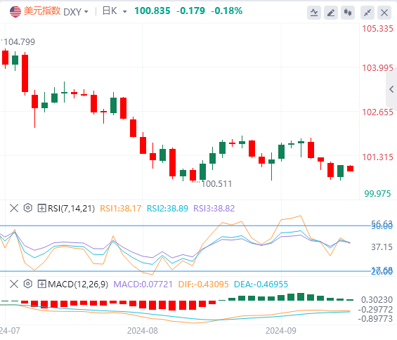 美元指数:截止发稿,美元指数交投于100.83附近。美元在周二美国交易时段开始时保持稳定,对零售销售数据的发布几乎没有像预期的那样做出反应。美元指数小幅走高,从年内低点回落,但仅出现轻微回升。美联储(Fed)宽松政策的可能性变得更大,市场定价暗示降息50个基点,而大多数分析师仍预测降息25个基点。技术面上,如果美元指数收于101.00水平上方,它将向最近的阻力位移动,该阻力位位于102.00–102.20区间。