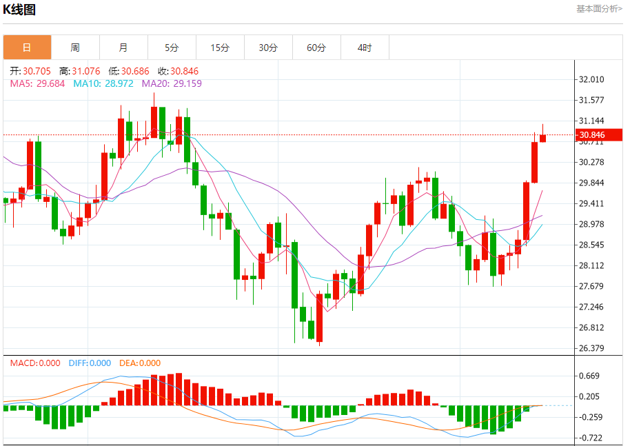 现货白银:截止北京时间20:23,现货白银上涨,现报30.849,涨幅0.50%。纽市盘前,白银价格在31.00美元面临坚实的阻力,等待获得有助于推动价格突破这一水平的积极动机,并打开向31.70美元反弹的道路,这代表着我们的下一个主要目标,继续暗示今天的看涨趋势,提醒您未能实现所需的突破将使价格承受负面压力,目标最初访问30.06美元区域。