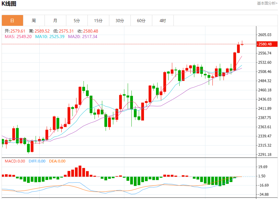 现货黄金:截止北京时间20:23,现货黄金上涨,现报2580.43,涨幅0.05%。纽市盘前,黄金价格在2590.00美元附近波动,等待更多的上涨以测试代表我们下一个目标的2600.00美元水平,提醒您突破它将延长牛市到达2622.00美元作为下一个正站,继续暗示今天的牛市趋势,除非突破2564.50美元并持有低于它。