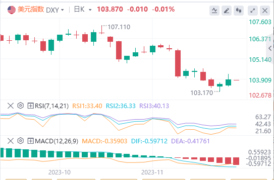 11月23日,周四亚市早盘,,美元指数短线回跌103.85,多头隔夜一度冲上104.22,强劲的劳动力市场和粘性通胀预期警告市场,美元多头需求惊现。以色列批准与哈马斯的人质协议,涵盖4天“暂停战斗”,黄金回调至1991美元,但技术分析认为短期回落提供战略切入点。