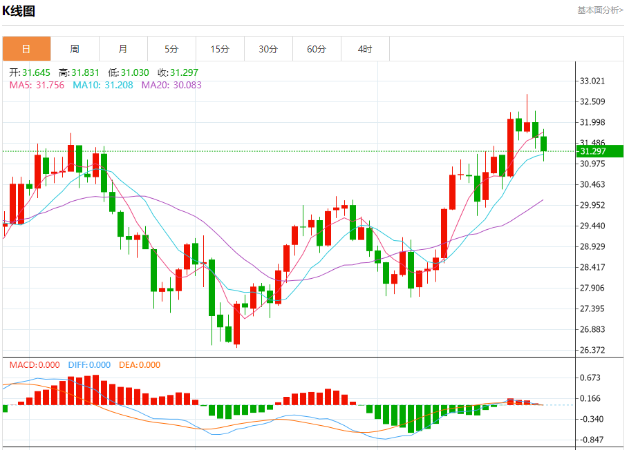 现货白银:截止北京时间20:20,现货白银下跌,现报31.268,跌幅1.13%。纽市盘前,自上午以来,白银价格稳定在31.50美元附近,只要价格低于31.70美元,我们的看跌观点今天仍然有效,因为我们主要在等待测试31.00美元,提醒您突破这一水平将推动价格向30.06美元方向发展,作为下一个负站。