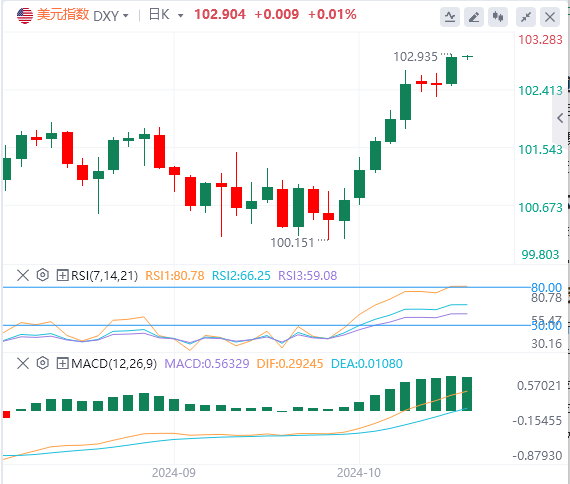 周三,美元指数持续走强,升至两个月高点,截至目前,美元指数报价102.90。
