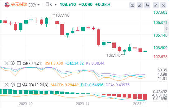 美元指数:截止发稿,美元指数交投于103.51附近。美国经济总体上显示出通胀降温和创造就业的迹象,标普PMI疲软也显示出经济疲软的迹象。这种经济前景使交易员相信,美联储(Fed)将采取不那么激进的立场,这将削弱美元。技术面上,尽管每日RSI接近超卖状态,表明看跌市场有点饱和,但它也表明,随着抛售压力的减弱,有可能逆转涨势。MACD强化了这一概念,它显示出扁平的红条,表明牛市情绪在没有明确方向的情况下有所缓和。此外,美元在20日、100日和200日SMA下方的位置也表明卖家占据了上风。