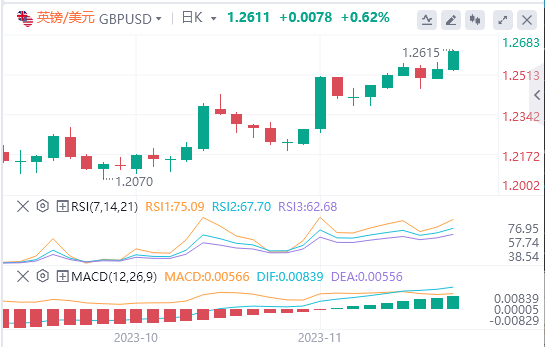 英镑:截止发稿,英镑/美元徘徊于1.2611附近。上周五英镑/美元上涨,收报1.2594,涨幅0.50%。英镑在周二英国央行决策者就11月货币政策报告举行的议会听证会上发表了鹰派评论。英国央行行长安德鲁-贝利在评论利率前景时表示,“风险在上升”。同时,在通胀方面,贝利指出,“市场低估了通胀持续的风险”。英国央行决策者凯瑟琳-曼表示,“通胀更加持续的前景意味着需要收紧货币政策”。技术面上,汇价上行的初步阻力位于1.2603,进一步阻力位于1.2714,关键阻力位于1.2815;汇价下行的初步支撑位于1.2494,进一步支撑位于1.2455,更关键支撑位于1.2420。