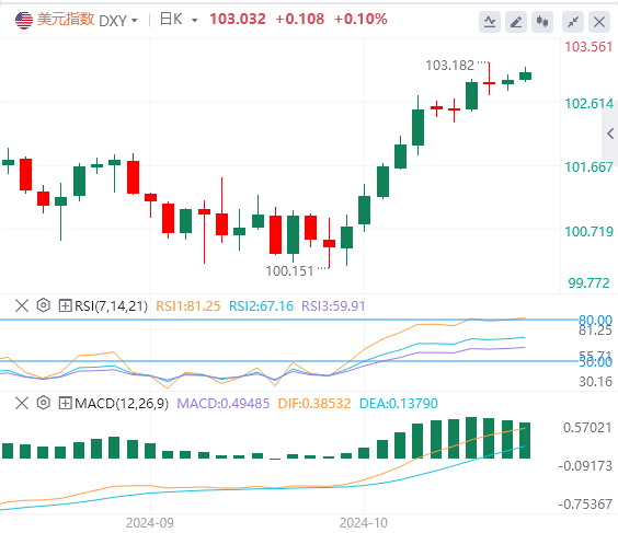 10月14日,北京时间周一亚市早盘,美元指数徘徊在103.03附近。上周五,因美国PPI反映出通胀进一步趋稳,美元指数几乎平收,最终收涨0.03%,报102.92。基准的10年期美债收益率收报4.1050%;对货币政策更敏感的两年期美债收益率收报3.9660%。因PPI数据表明通胀前景仍然有利,支撑了美联储下个月降息的预期,现货黄金涨逾1%,最高触及2661.37美元,最终收涨1.04%,报2657.03美元/盎司。现货白银最终收涨1.22%,报31.52美元/盎司。因利比亚国家石油公司产量已恢复到正常水平,国际油价小幅下跌。WTI原油最终收跌0.15%,报75.44美元/桶;布伦特原油收跌0.48%,报78.85美元/桶。