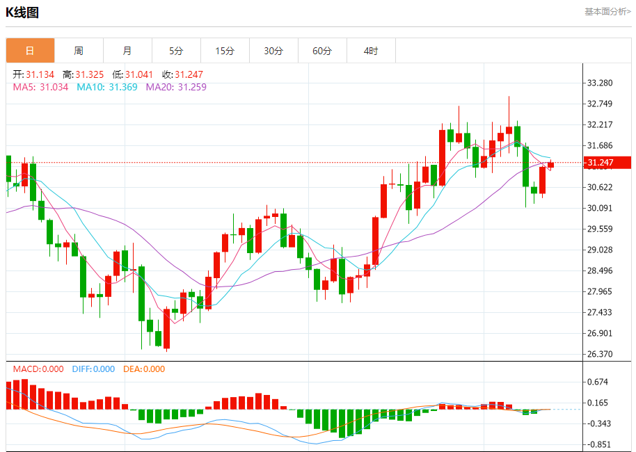 现货白银:截止北京时间20:20,现货白银上涨,现报31.265,涨幅0.41%。纽市盘前,白银价格在EMA50附近波动,受到随机负面因素的影响,阻碍了继续上涨的使命,只要价格高于31.00美元,我们今天的看涨观点将保持有效,等待获得积极的动机,以帮助推动价格达到我们的目标,从31.70美元开始,延伸到32.50美元。