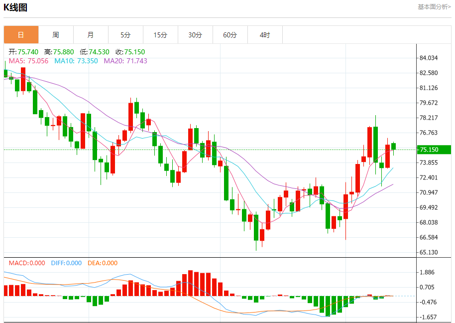 原油市场:截止北京时间20:20,美油下跌,现报75.210,跌幅0.80%。纽市盘前,原油价格现在面临明显的负面压力,以攻击75.65美元的水平,并试图保持在该水平以下,这促使人们在即将到来的交易中保持谨慎,因为确认突破并最初在该水平以下收盘4小时将使价格在即将到来的交易中面临负面压力,以在任何新的上涨尝试之前测试73.70美元的区域。