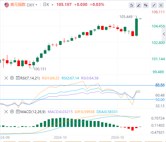 11月7日,北京时间周四亚市早盘,美元指数徘徊在105.18附近。周三,由于特朗普胜选后的移民、税收和贸易政策预计将刺激美国更高的增长和通胀,美元指数飙升至四个月新高,最终收涨1.686%,报105.16,创2020年3月以来最大单日涨幅。美债收益率全线上涨,基准的10年期美债收益率收报4.435%;对货币政策更敏感的两年期美债收益率收报4.266%。随着投资者在特朗普当选美国总统后涌入美元,现货黄金日内重挫近85美元至三周低点,最终收跌3.08%,报2659.56美元/盎司,创五个月来的最大单日跌幅。现货白银最终收跌4.56%,报31.17美元/盎司。国际原油V型反转,因投资者权衡强势美元与特朗普的外交政策计划可能挤压全球石油供应的可能性。WTI原油盘中一度跌破70关口,随后抹去部分跌幅,最终收跌0.22%,报71.56美元/桶;布伦特原油收跌0.38%,报75.06美元/桶。