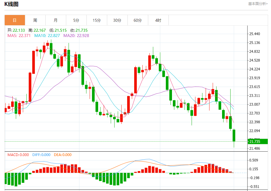 现货白银:截止北京时间20:21,现货白银下跌,现报21.732,跌幅1.94%。纽市盘前,白银价格显示出额外的负面交易,接近我们等待的扩展目标21.35,我们预计将见证更多的下跌超过这一水平,并遭受额外的损失,达到20.70。地区。