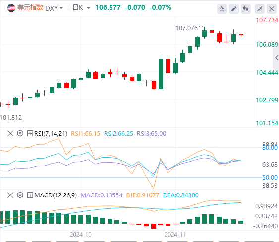 周三,因市场普遍认为特朗普上台将提振美元,随着特朗普政府逐渐明确,美元指数三连跌后反弹,截至目前,美元报价106.57。