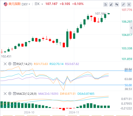 周四,因市场预期美联储明年降息次数将减少,美元指数延续昨日涨势,截至目前,美元报价107.16。
